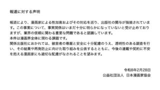 芸スポ 日本漫画家協会、漫画家の性加害および対応…漫画騒動に声明「信頼に関わる重要な課題」「漫画界全体に関わる課題」