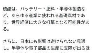 ニュー速 中国、硫酸輸出停止の意向。日本への影響避けられない見通し
