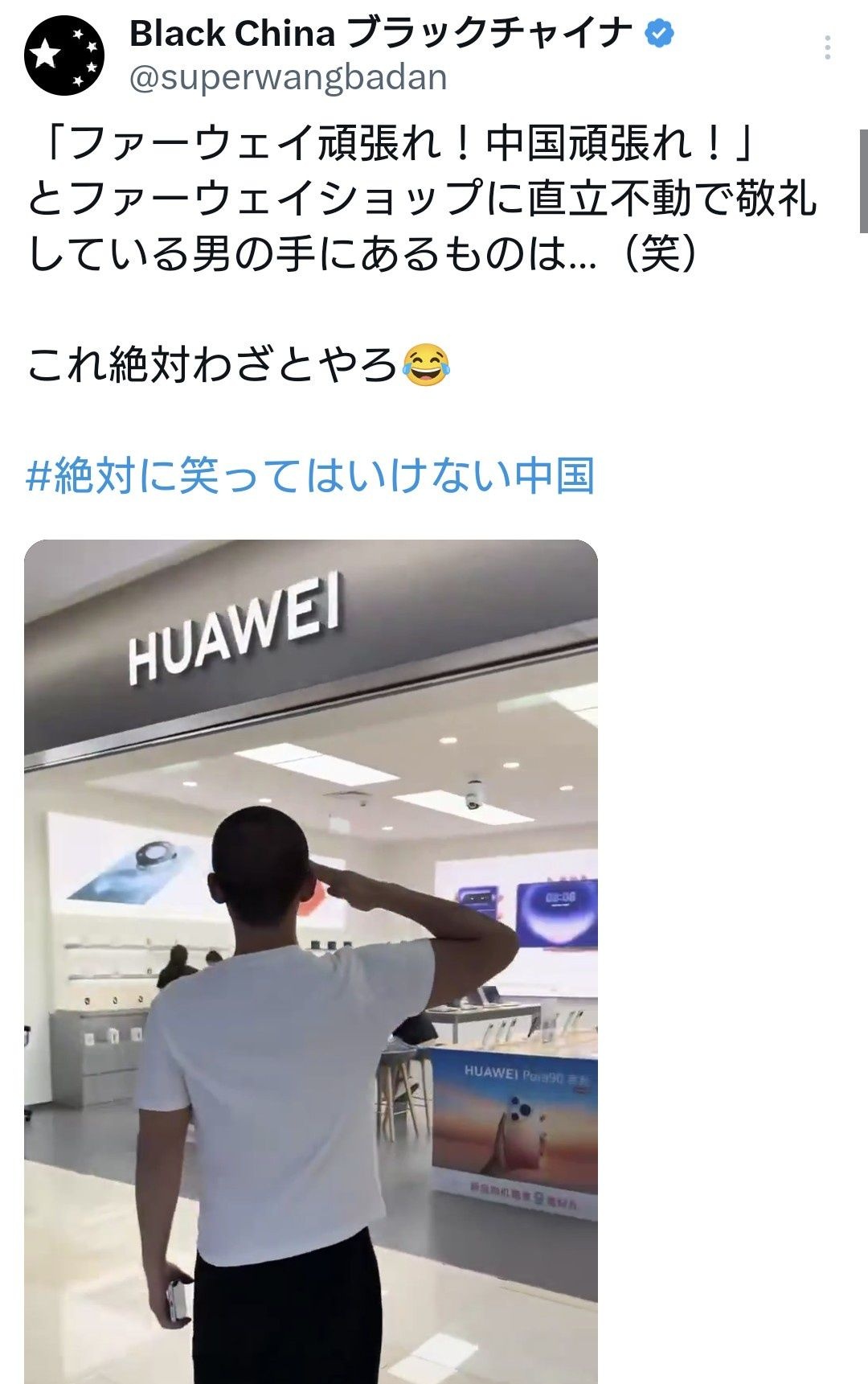 「ファーウェイ頑張れ!中国頑張れ!」と直立不動で敬礼している中国人。手にあるものは…
