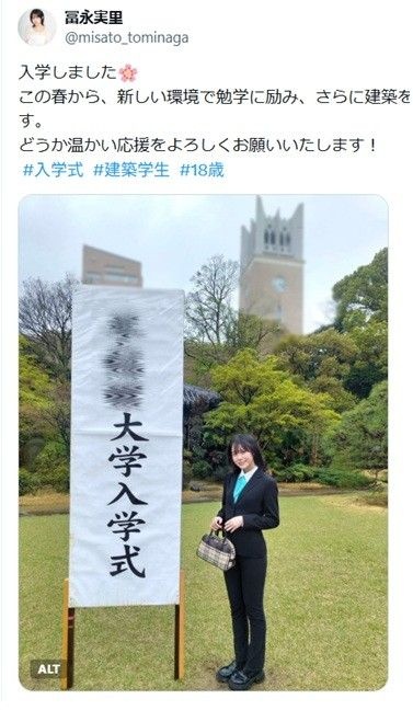 冨永は「入学しました この春から、新しい環境で勉学に励み、さらに建築を探究し続けていきます。 どうか温かい応援をよろしくお願いいたします!」と投稿。ハッシュタグを付けて 「#入学式 #建築学生 #18歳」と投稿した。