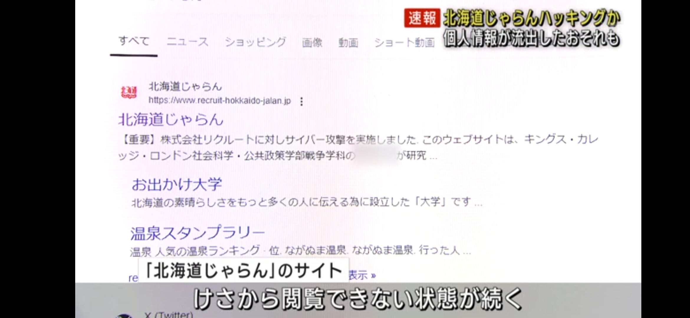 山上暢記者:「北海道じゃらんのページを検索すると、このように『サイバー攻撃を実施しました』と書かれています。こちらクリックしてみると、何も表示されないんです」。