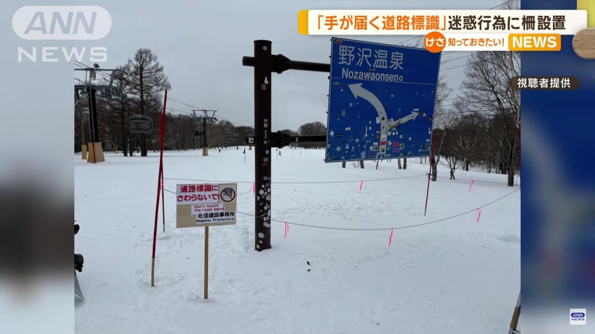 迷惑行為を受け、長野県は周辺をロープで囲い、標識に触れないよう呼び掛けています。