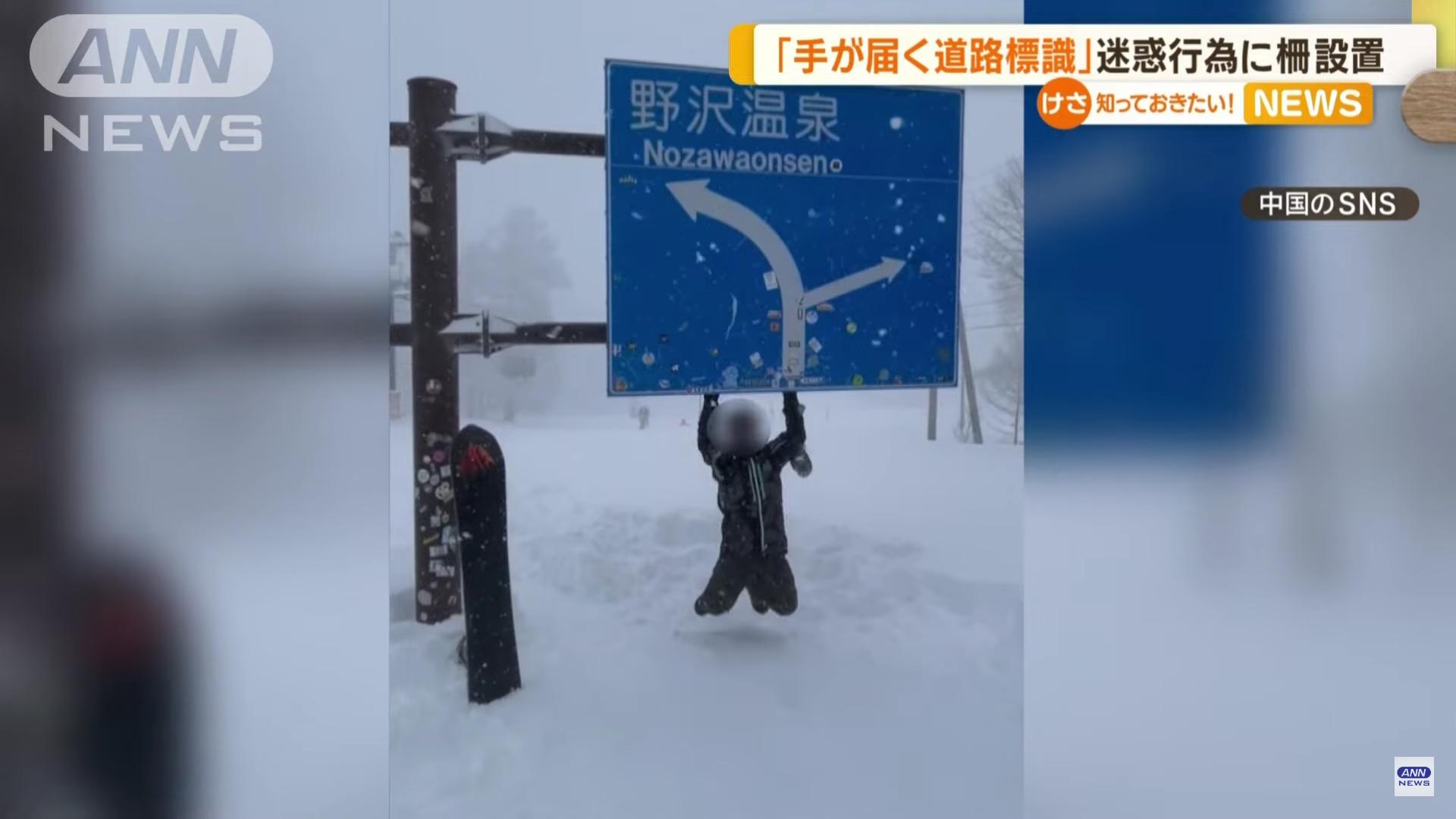 中国のSNSには、スキー客が標識にぶら下がりピースをする様子も投稿されていました。