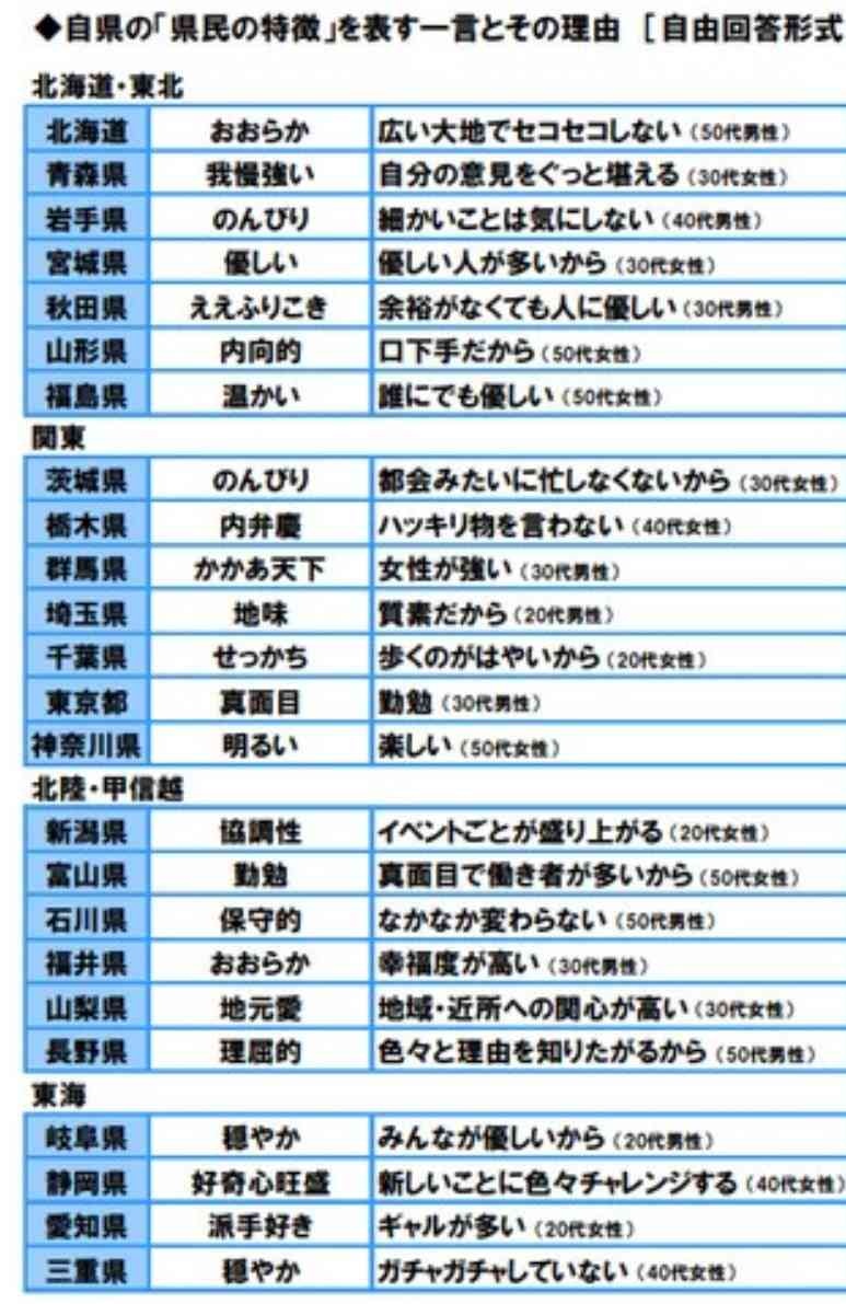 一方で、複数の都道府県で共通して挙げられた特徴もありました。▽「おおらか」:北海道、福井県