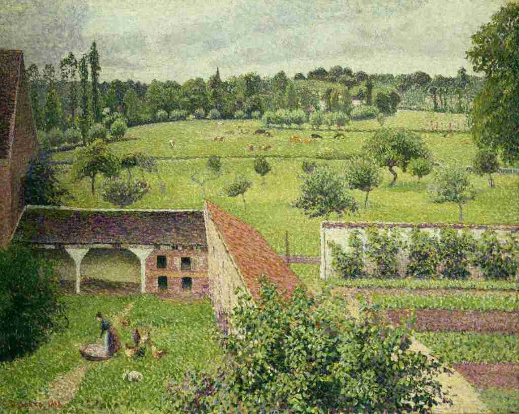 《エラニー、アトリエにて (The Studio at Eragny)》のような作品では、ピサロが持つ質感と色彩に対する卓越した感覚が見て取れる。ゆるやかでありながら的確に配置された筆致が、それを一層際立たせている。同じエラニーを描いた《わが窓からの眺め、エラニー (View from my Window, Eragny)》では、制作時期が数年前に遡るため、19世紀後半に流行した点描技法への実験的な関心がうかがえる。