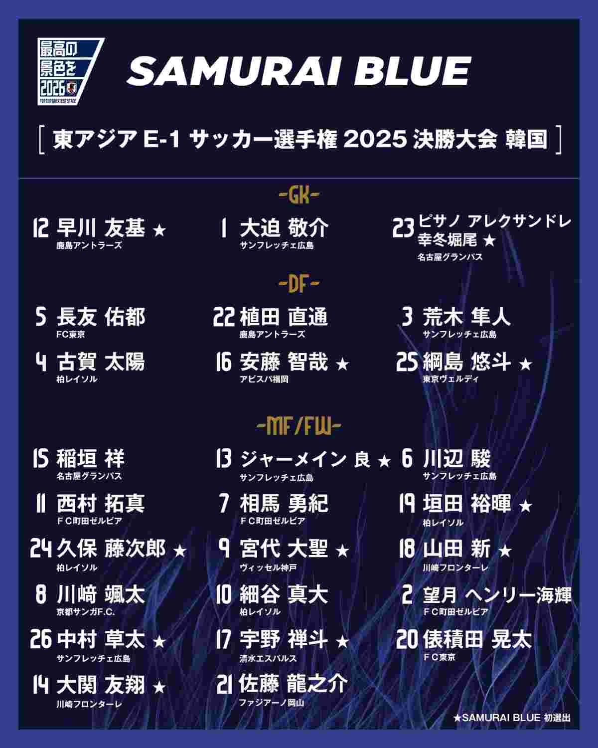サッカーの東アジアE―1選手権2025決勝大会(7日から16日、韓国・龍仁ミルスタジアムなど)に出場する男子の日本代表26人が3日、日本サッカー協会から発表され
