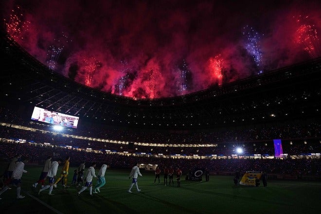 スタンドも大きな盛り上がりを見せるなか、極めつけは、選手紹介や選手入場に合わせ屋根上からの鮮やかな特殊効果花火。またピッチの上には、クラブ史上初だというミラーボールやLEDビジョンをぶら下げたドローンが飛行を行なうド派手な演出も行なわれた。