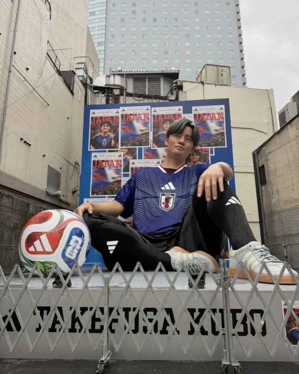 新ユニホームを着用して、座って笑みを浮かべる表情は迫力満点。16日まで公開予定で、SNS上では早くも「でっかい久保建英が座っておった」「巨大すぎる!」など話題を集めていた。