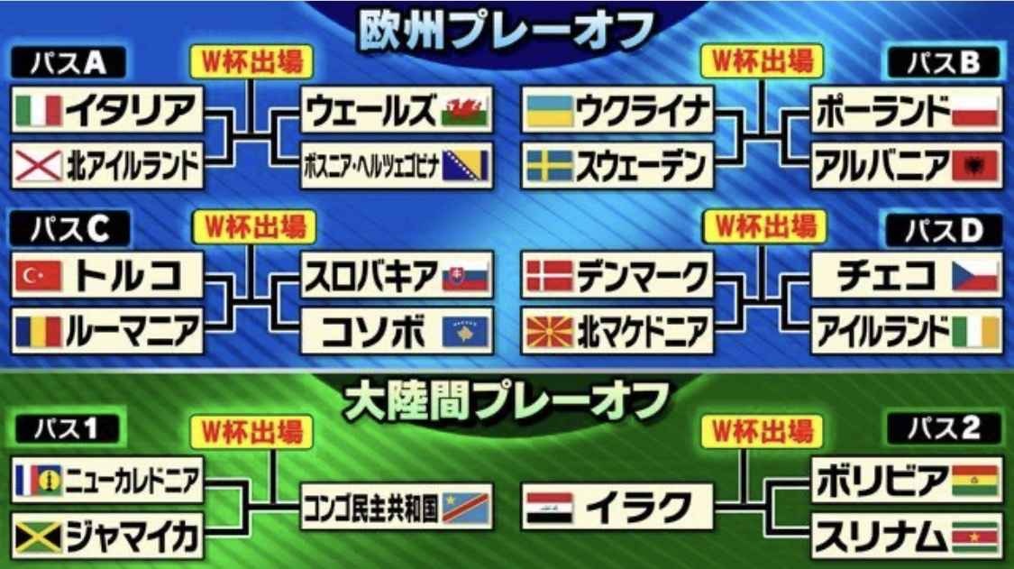 パスBに当たるウクライナ、スウェーデン、ポーランド、アルバニアの4チームから勝ち上がったチームは、本大会で日本がいるグループFに入ることになっています。大陸間プレーオフはヨーロッパ以外の6チームが3チームずつ2つのトーナメントに分かれての争い