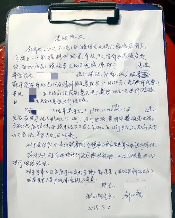 かかる費用もすべて負担します」と説明した。ネット上では、店側と客側の合意覚書とされる、手書きの文章が広まった。文章には、店側が客の持ち物や精神的損害についての