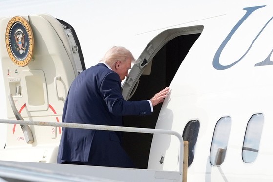専用機「エアフォースワン」に搭乗しようとしている。[写真 AP=聯合ニュース]米国のドナルド・トランプ大統領が4日(現地時間)、米国外で製作されたすべての映画に100%の関税を賦課すると発表した。