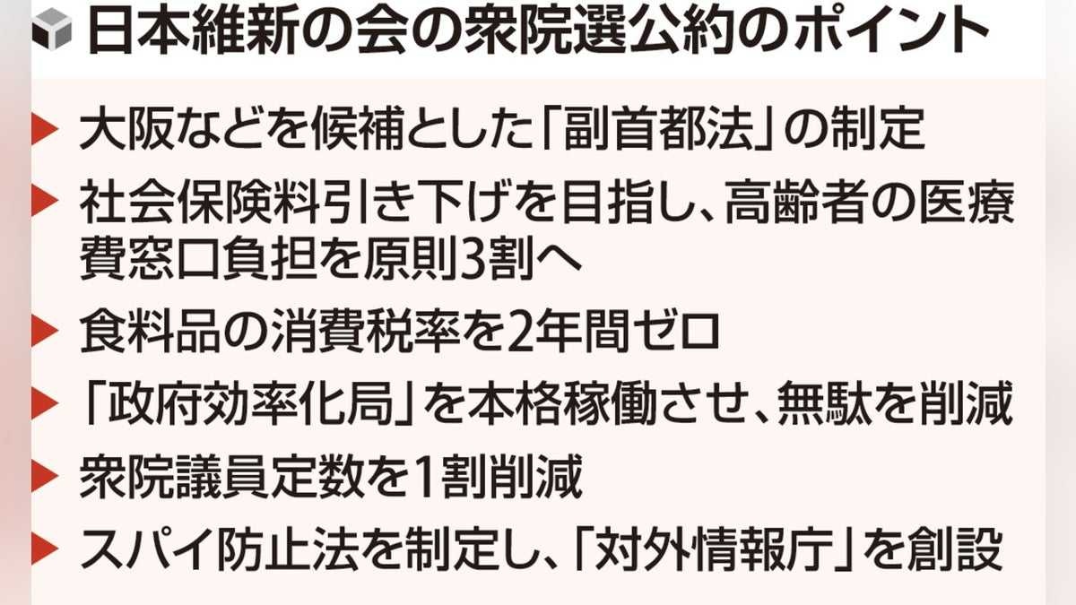 日本維新の会は21日、衆院選公約を発表した。東京一極集中を是正する「副首都法」の制定や社会保険料の引き下げ、時限的な消費税減税などを打ち出した。