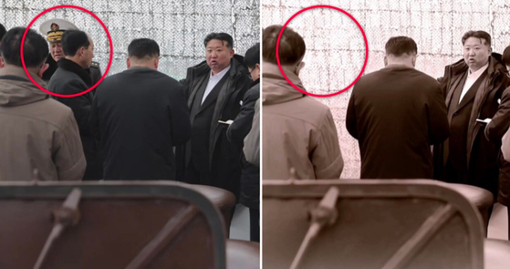 報道では金明植(キム・ミョンシク)海軍司令官とホン・ギルホ清津(チョンジン)造船所所長が金委員長とともに立っていたが、今回は2人の姿が消された。2人は駆逐艦進水事故関連で処罰を受けたと推定される人物だ。