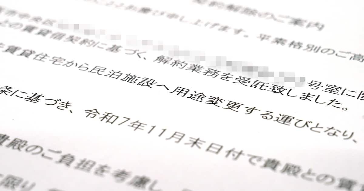 通知にはこのマンションを特区民泊に転用すること、さらに6月末までに解約すれば転居支援金として30万円を支払うものの、11月末になるとその額は「0円」になるとも記載されていた。男性は「何かの冗談かと思った。信じられなかった」と振り返る。