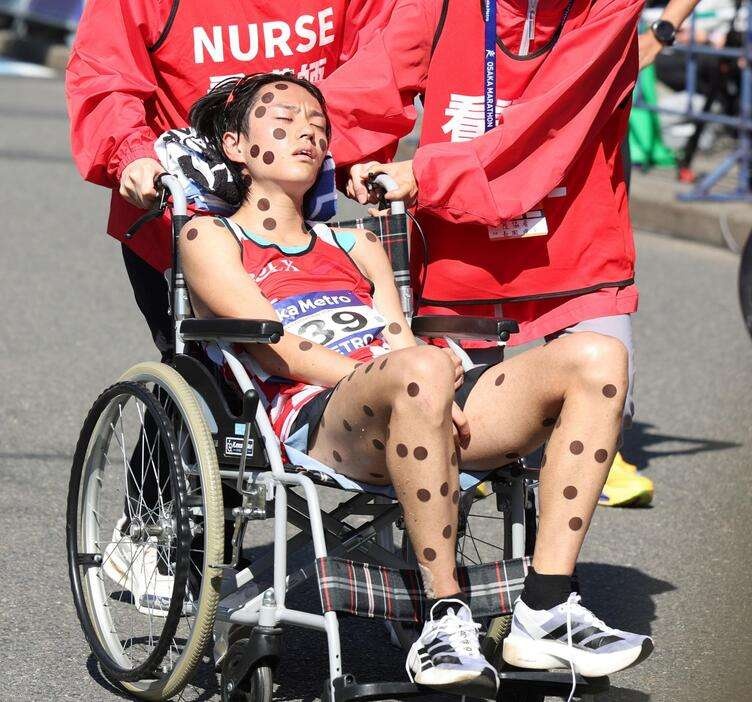 ゴール後には自分で起き上がることができず、スタッフに寝たまま給水してもらうシーンも。その後、車椅子で救護室へ運ばれていた。