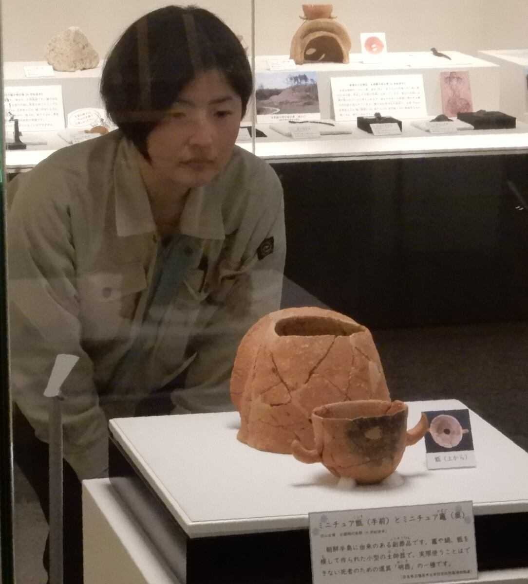 会場には、ミニチュア炊飯具のかまどや、コメを蒸すこしき、鍋などを展示。ほぼ同時代にあたる渡来人の周辺古墳である真弓鑵子塚(まゆみかんすづか)古墳(明日香村)や与楽(ようらく)鑵子塚古墳(高取町)、与楽カンジョ古墳(同)の副葬品も集めている。