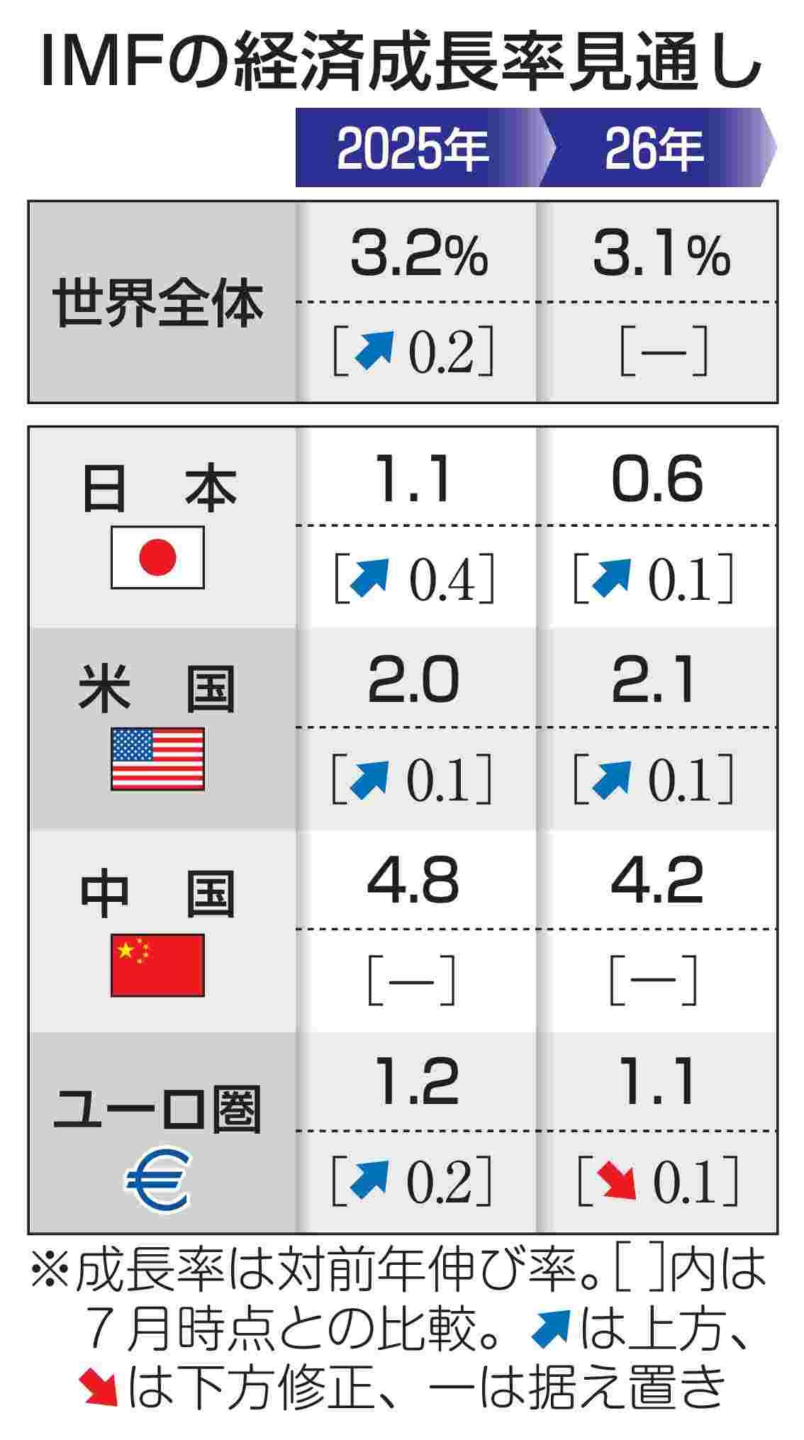 【ワシントン共同】国際通貨基金(IMF)は14日公表の世界経済見通しで、世界全体の2025年の実質成長率を3.2%と見込み、7月時点の前回予測から0.2ポイント上方修正した。トランプ米政権の関税強化による影響が想定より小さく、各国が報復措置を控えたことなどを反映した。ただ新型コロナウイルス感染症流行前の平均3.7%を下回る。