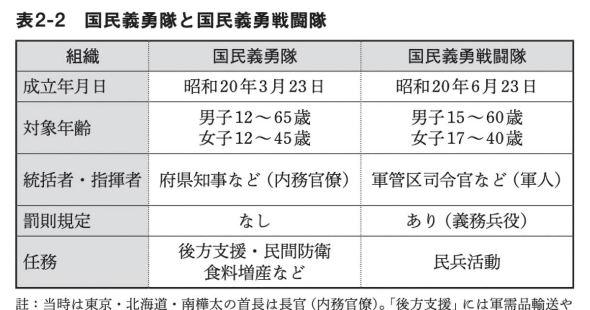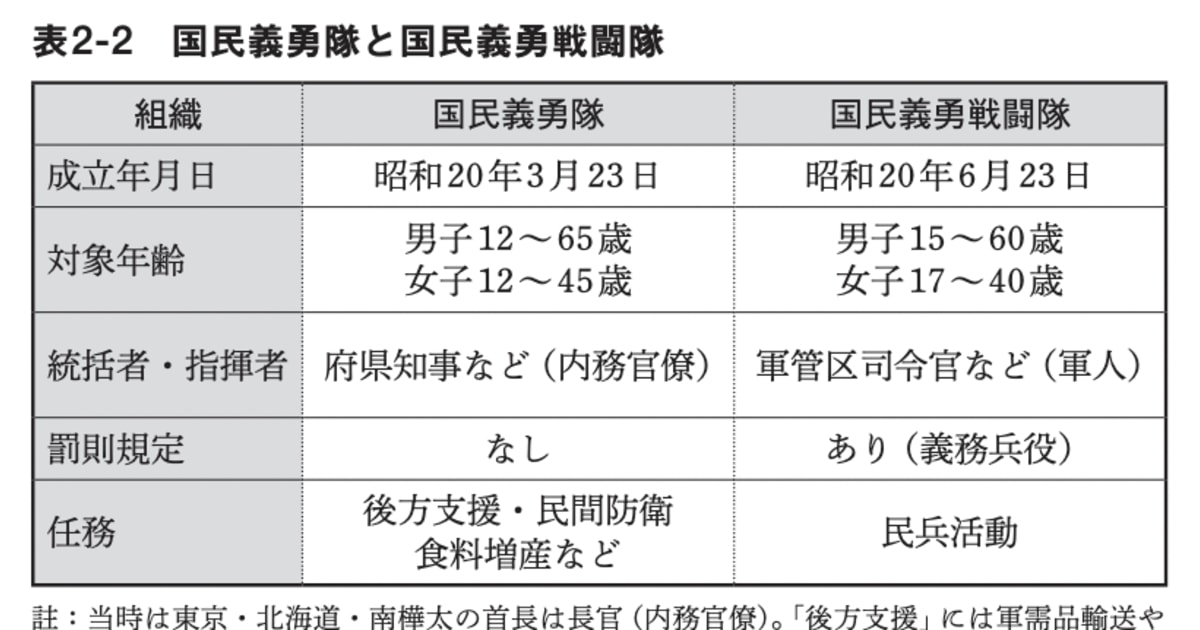 ここで紛らわしいのだが、国民義勇隊とは別に6月23日付で「戦闘」の2文字が付く「国民義勇戦闘隊」の制度ができた(表2-2)。この前日に、15~60歳の男子と17~40歳の女子を対象とする「義勇兵役法」が制定されている。これには罰則が付いていた。