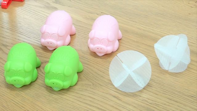 ブタ型のマスコットから空気を出し、羽根を落とさないよう飛ばし合うゲーム