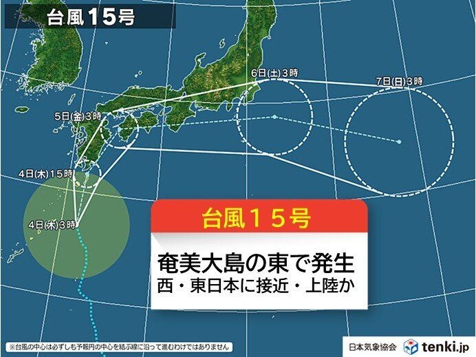 今日4日(木)午前3時、奄美大島の東で、台風15号「ペイパー」が発生しました。今日4日には九州にかなり接近し、その後、5日にかけて四国~関東にかなり接近または上陸する恐れがあります。発生してから接近、上陸までの時間が短いため、早めの対策が必要です。
