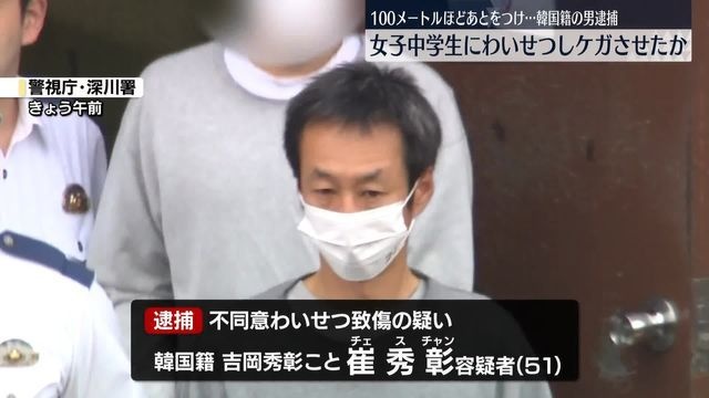 100メートルほど後をつけ…女子中学生にわいせつしケガさせたか 韓国籍の男逮捕(日テレNEWS NNN) - Yahoo!ニュース東京・江東区の路上で面識のない女子中学生にわいせつな行為をしたうえ、ケガをさせたとして韓国籍の男が逮捕されました。 警視庁によりますと、韓国籍の吉岡秀彰こと崔秀彰容疑者(51)は先月、江東区の路上news.yahoo.co.jp