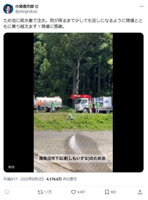 小泉氏は3日、「農水省が手配した給水車でため池に給水。車が入れる。取水場所が近くにある。この2つの条件が整えば給水車も手配します。現場作業に出動して下さった皆さん、ありがとうございました。できることは何でもやります」とポストした。