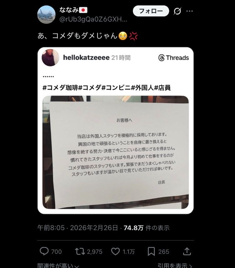 【画像】コメダ珈琲店「外国人差別に反対します」ネトウヨ「もう二度とコメダには行かない」