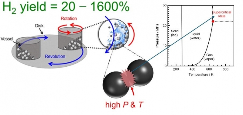 室温で金属粉末と水から水素を生成する技術を開発した。ボールミルの衝撃を利用して化学反応を起こし、