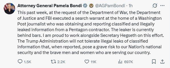 ボンディ司法長官は14日、SNSで「国防総省の契約業者から機密情報および違法に漏えいされた情報を入手・報道していたワシントンポスト紙の記者の自宅に対し捜索令状を執行した」と明らかにしました。