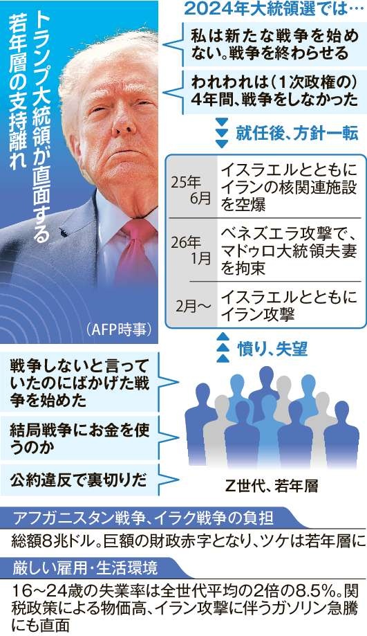 トランプ米大統領が1990年代半ば以降に生まれた「Z世代」の支持離れに直面している。イラク戦争など米国の対テロ戦争の泥沼化を見て育ち、海外への軍事介入に否定的とされる世代で、トランプ氏が踏み切ったイラン攻撃は「米国第一主義」への裏切りと映るという。雇用環境の悪化に加え、イラン攻撃によるガソリン高など生活の苦しさも相まって、今後若者の不満は強いうねりとなりかねない。