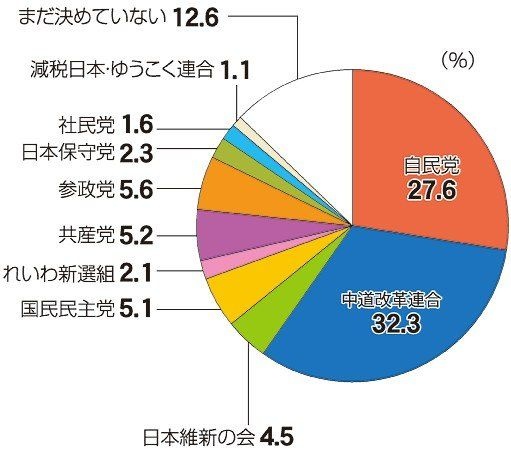 調査で鳥取県の比例投票先は中道が最多の32・3%で、自民を4・7ポイント上回った。一方、支持政党は自民が37・6%、中道が17・3%と2倍以上の差がある。自民支持層が選挙区は自民候補を選びながら、比例では一部が中道に流れているとみられる。