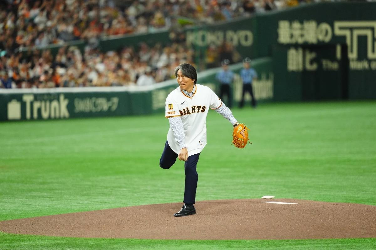 球審は高橋氏、捕手は阿部慎之助監督が務め、夢のような豪華ショットにファンも感動の歓声を上げた。