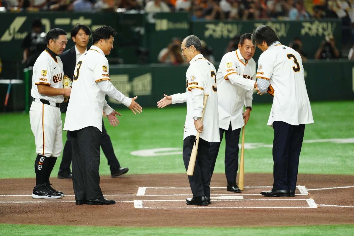 まず中畑氏が特別仕様のベースを三塁に設置。続いて堀内氏がピッチャープレートにボールを置き、セレモニアルピッチで松井氏が投手を務め、王氏と原氏が左右の打席に立った。