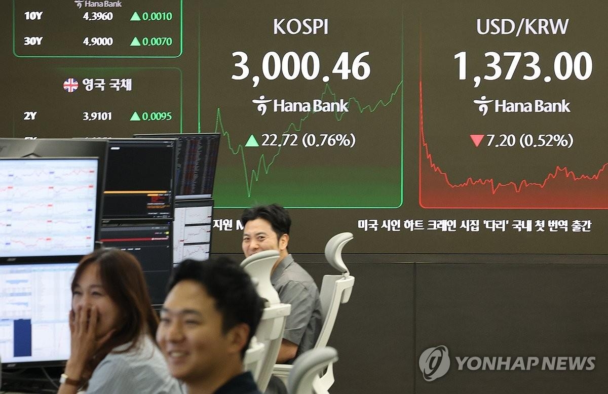【ソウル聯合ニュース】20日の韓国株式市場で総合株価指数(KOSPI)は続伸して始まった。前日比8.78ポイント(0.29%)高の2986.52で寄り付き、午前10時45分現在、3000.46まで上昇した。取引時間中に節目の3000を突破するのは2022年1月3日(3010.77)以来およそ3年5カ月ぶり。