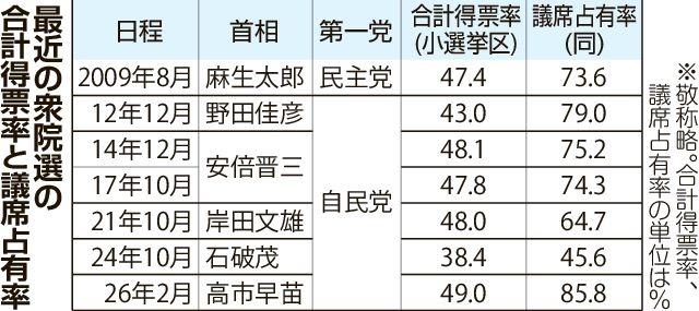 得票率と小選挙区の議席数は大きく乖離(かいり)し、今回の衆院選で全国の投票総数に占める自民の合計得票率は49・0%なのに対し、獲得したのは全289議席の85・8%に当たる248議席。合計得票率が21・6%だった中道改革連合の獲得議席は7議席だった。国民民主党などと候補を一本化せず、各選挙区で野党候補が乱立したためと言える。