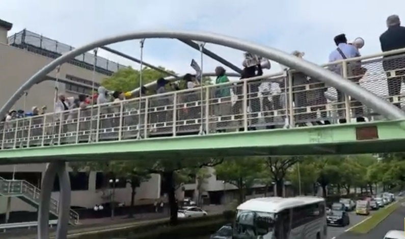 定例会見に合わせて県庁前の歩道橋を占領