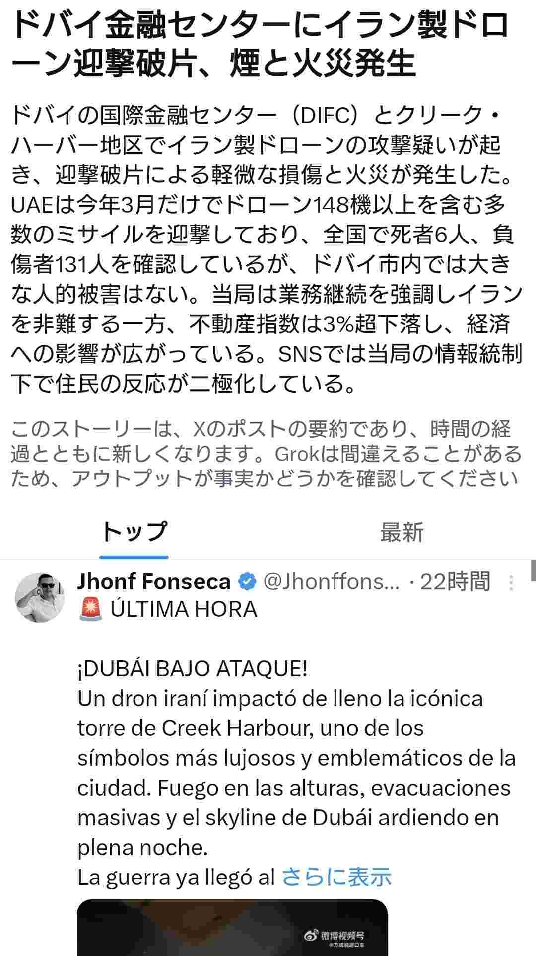 ドバイの国際金融センター(DIFC)とクリーク・ハーバー地区でイラン製ドローンの攻撃疑いが起き、迎撃破片による軽微な損傷と火災が発生した。UAEは今年3月だけでドローン148機以上を含む多数のミサイルを迎撃しており、全国で死者6人、負傷者131人を確認しているが、ドバイ市内では大きな人的被害はない。当局は業務継続を強調しイランを非難する一方、不動産指数は3%超下落し、経済への影響が広がっている。SNSでは当局の情報統制下で住民の反応が二極化している。