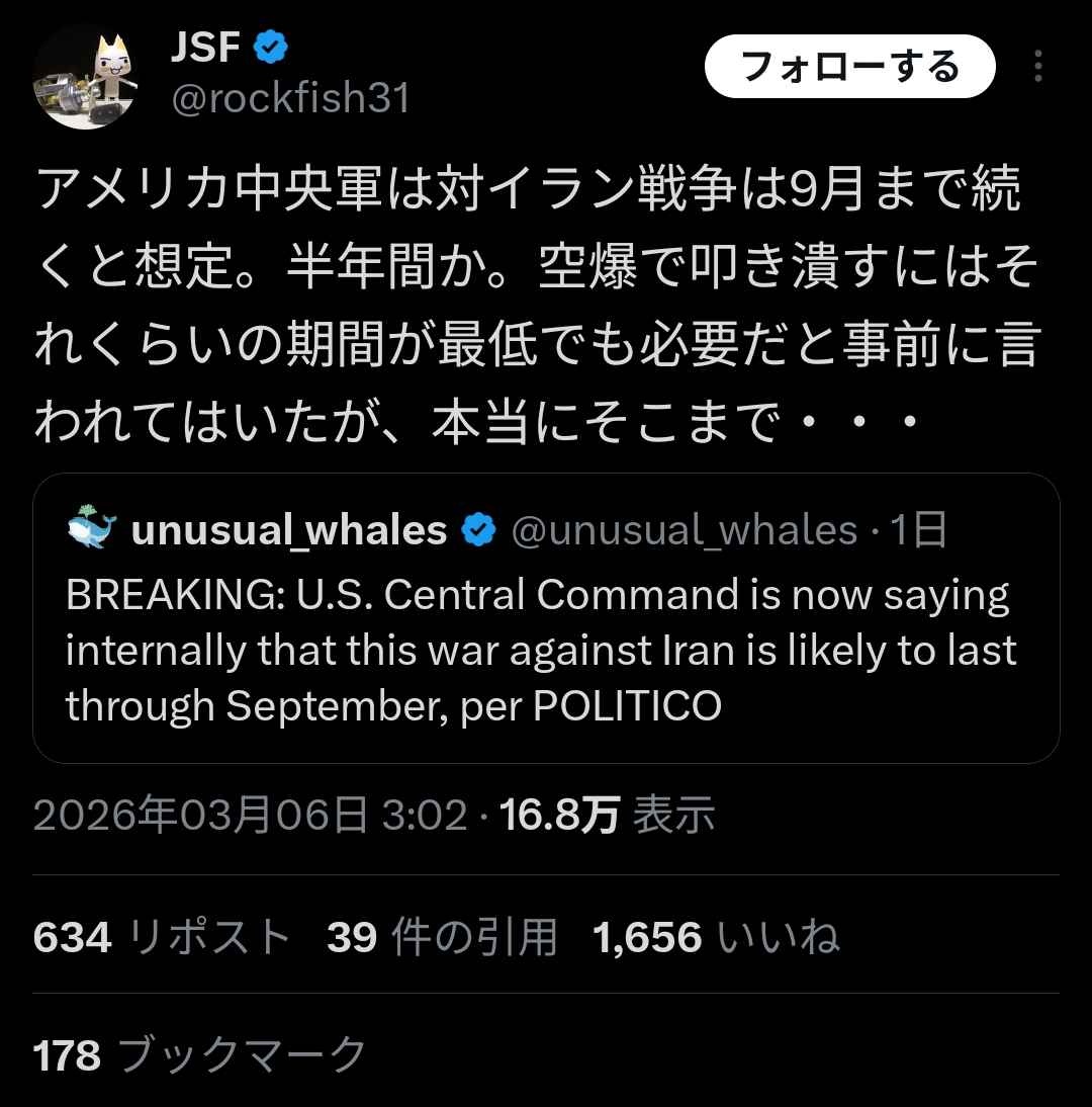 アメリカ中央軍は対イラン戦争は9月まで続くと想定。半年間か。空爆で叩き潰すにはそれくらいの期間が最低でも必要だと事前に言われてはいたが、本当にそこまで・・・