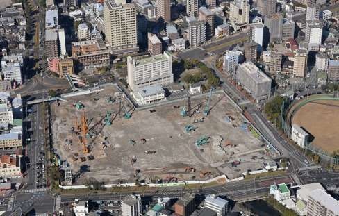 イオン九州(福岡市)によると、工期は10月末まで。既に鉄筋コンクリート2階建ての建物(店舗面積約2万1000平方メートル)や立体駐車場は取り壊された。小さく見えるいくつもの大型重機が、土地の広さを際立たせる。