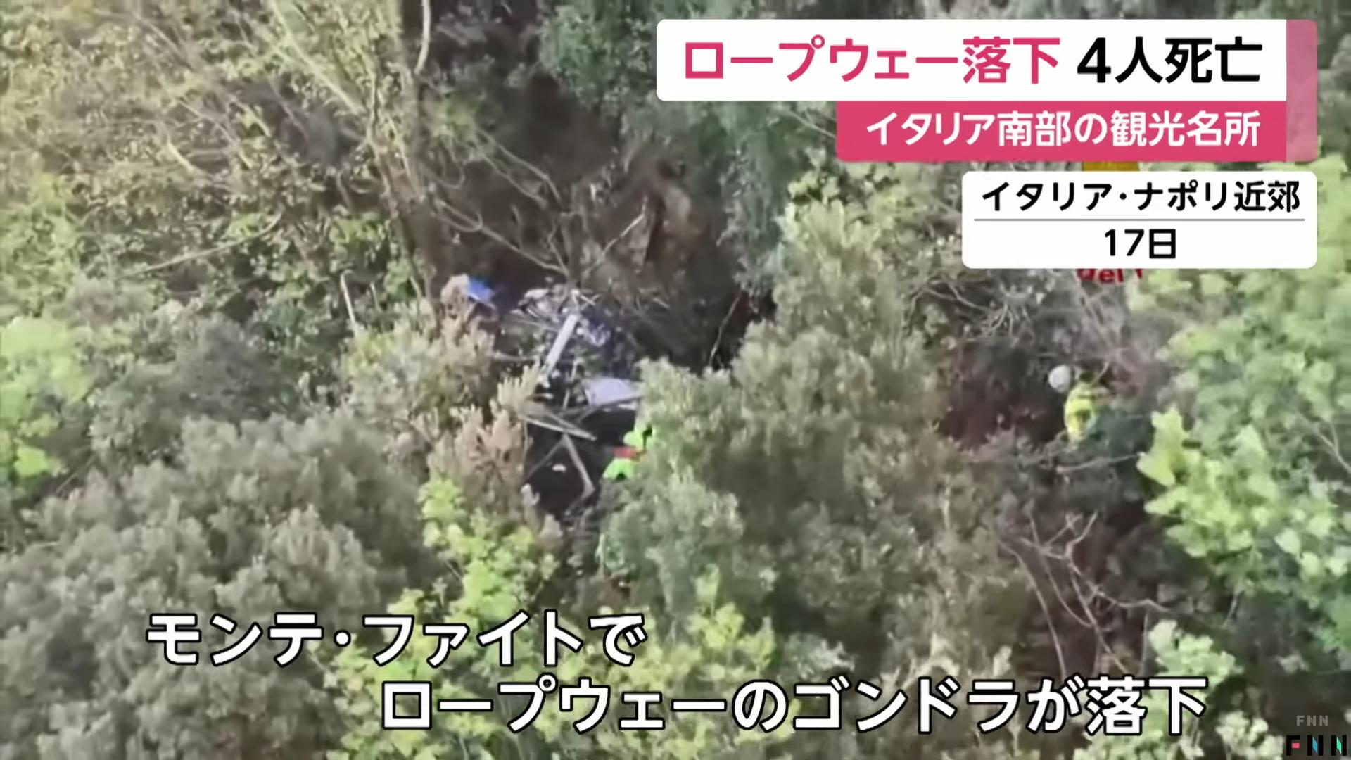 イタリア南部ナポリ近郊で運行中だったロープウェイのゴンドラが落下して少なくとも4人が亡くなる事故が発生した。