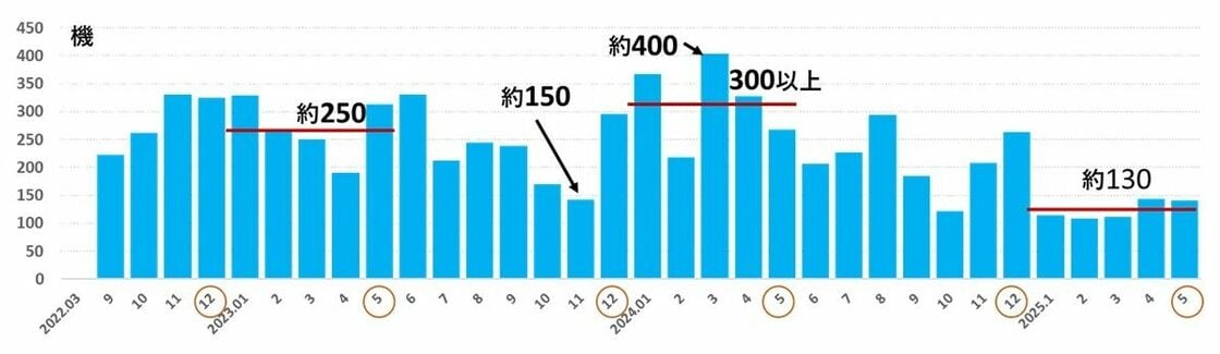 例えば、1月から5月までの5か月間の回数を比較すると、2023年では平均約250発、2024年で300発以上、2025年で平均130発である。