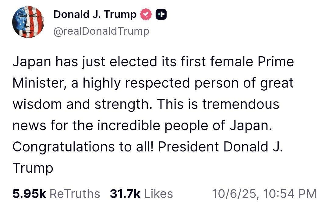 日本は、偉大な知恵と力強さを持ち、非常に尊敬される初の女性首相を選出しました。これは素晴らしい日本国民にとって素晴らしいニュースです。皆様、おめでとうございます!