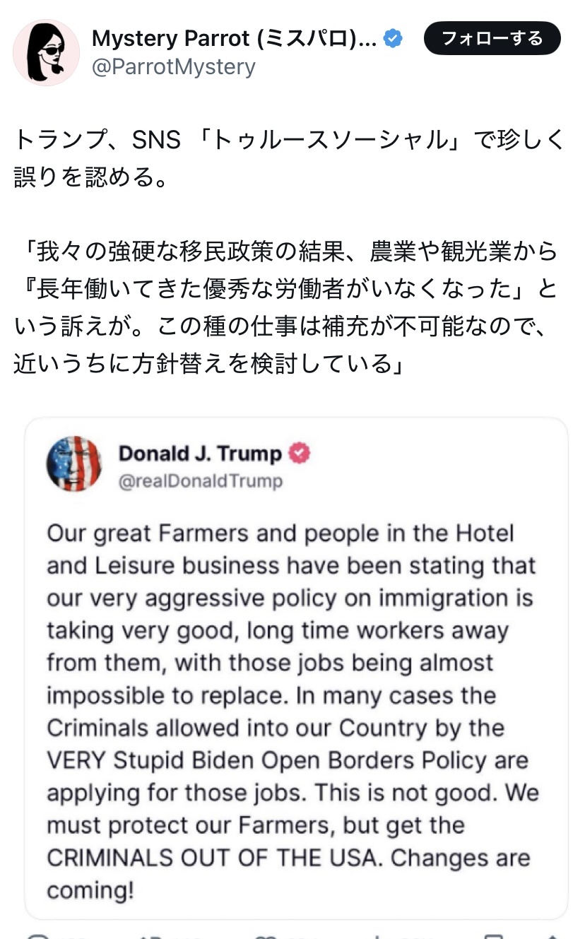 トランプのX翻訳したら堂々と不法移民の事不法エイリアンって言ってて笑ったw