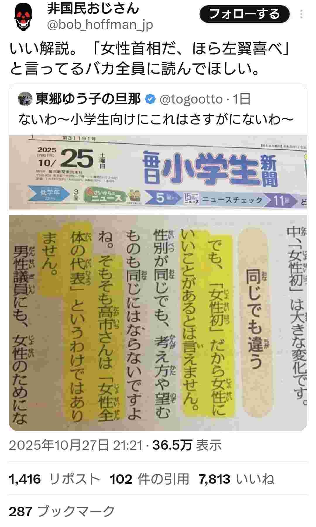 別に高市が全女性の代表じゃ無いのなんて当たり前だし、今までの男性総理が全男性の代表じゃ無いのも当たり前