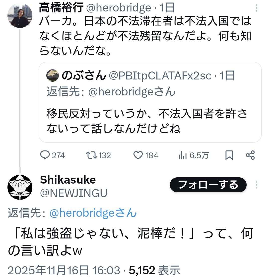 不法入国なんて誰も言ってないし不法滞在って言ってるのに脳内で不法入国に変換されるパヨ脳って。
