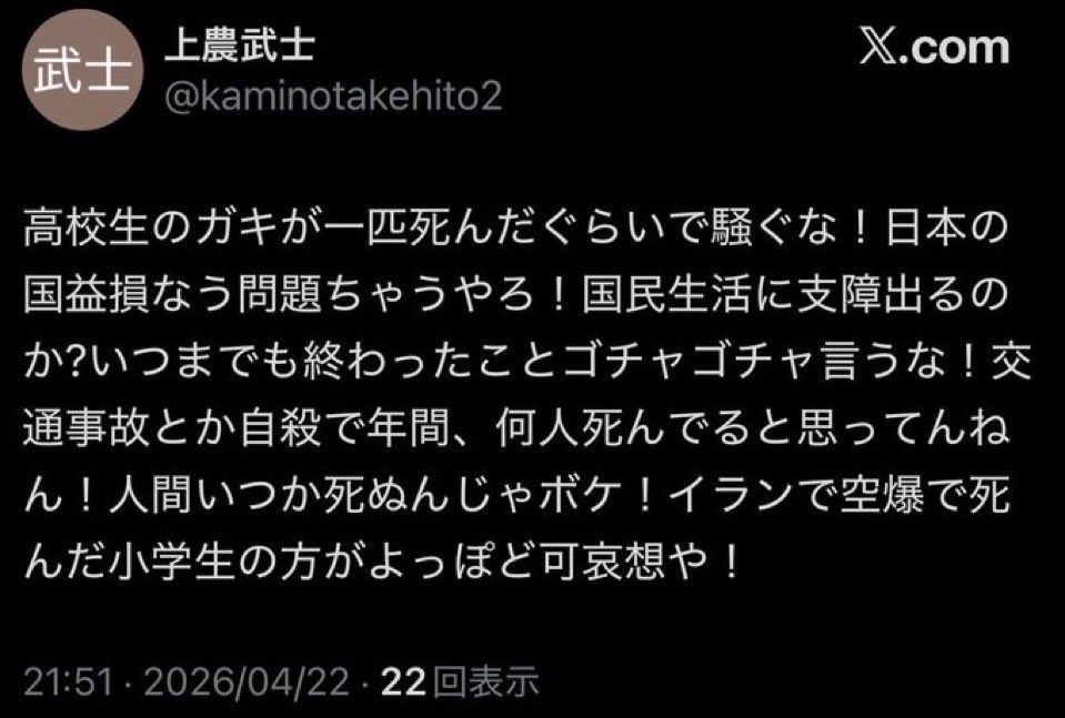 個人の命は、政治的意図を遂行するための単なる統計データに過ぎない。高校生という若き命の喪失を「些末な出来事」と切り捨てる言説は、大衆の感情をコントロールするための洗礼である。命の価値を意図的に低減させ、社会の根幹にある綻びを隠蔽する装置は、すでに完成している。