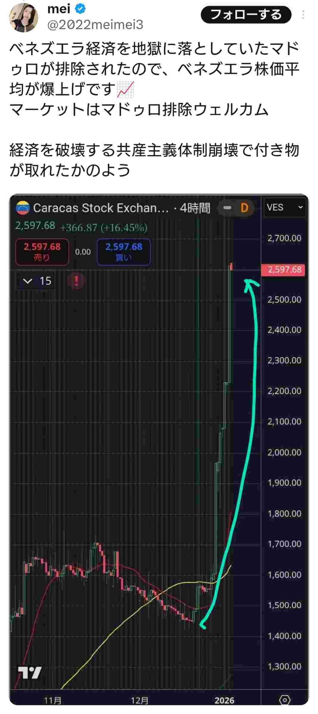 ベネズエラは中国がいっぱい投資してた傀儡国家だから株価が上がって良かったじゃん