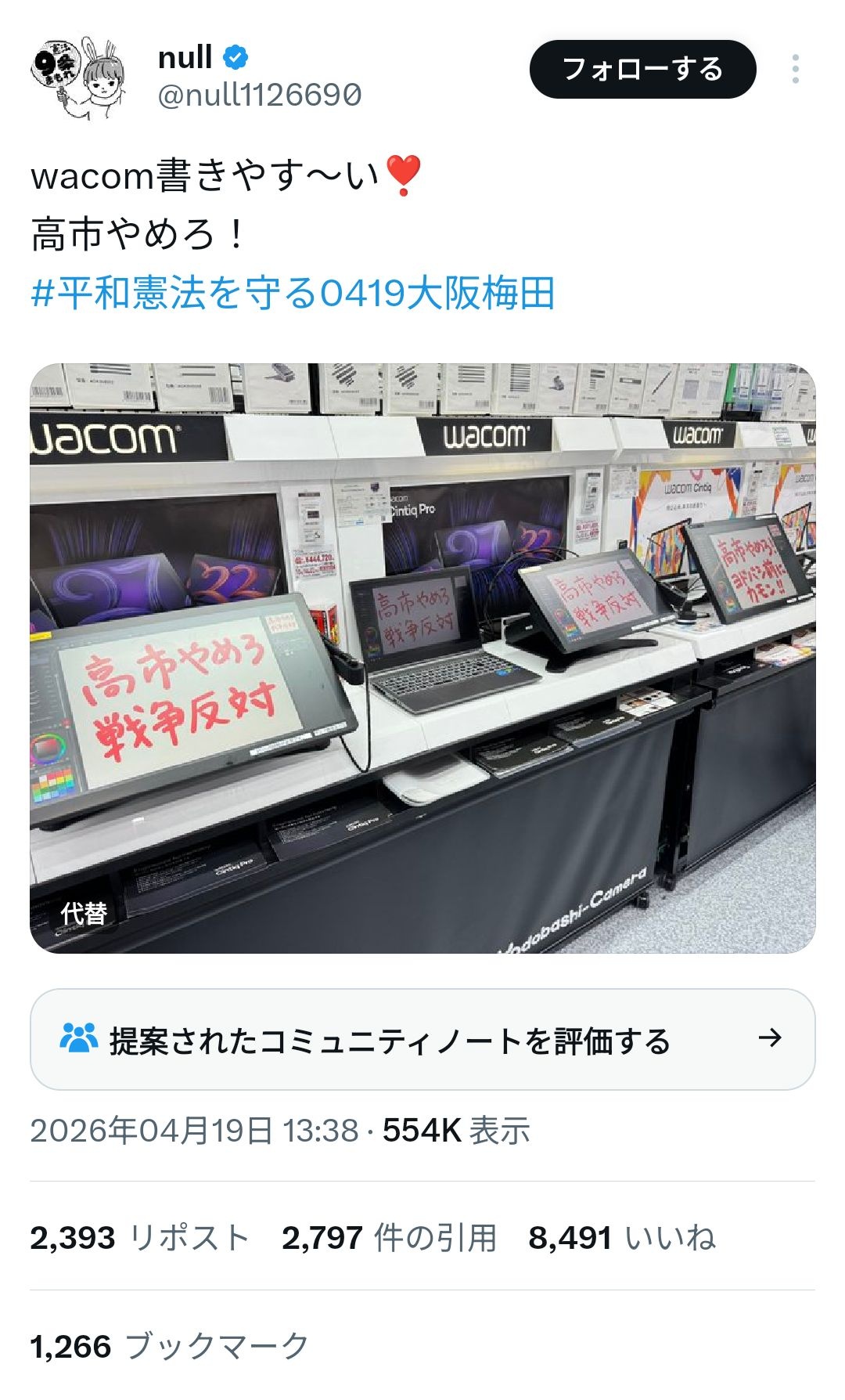 ヨドバシ梅田、限界左翼のせいで液タブの電源が全てオフに