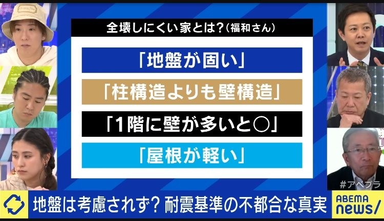 専門家「あと言いづらいんですが、マンションより一戸建ての方が災害に強いです。マンションは構造計算をしていますが、戸建は構造計算の義務はないので、余裕を持った設計をしています。つまりマンションは基準ありきですが、戸建は基準ではなく過去の経験ベースで建てています。建築基準法さえ満たしてればいいという建設法にしていないか、頭の隅に置いておく必要があります。」