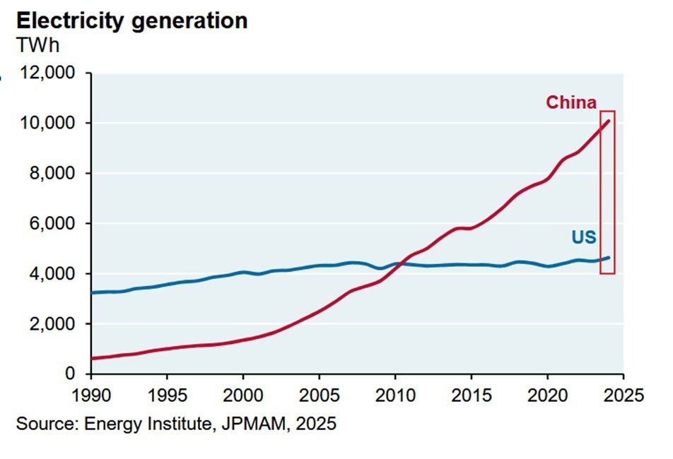 2019年以降、中国の発電量は約2,500TWh増加し、伸び率は33%に達しました。同じ期間で見ると、米国の増加分はわずか221TWh(6%増)にすぎず、欧州に至っては110TWh減少しています。